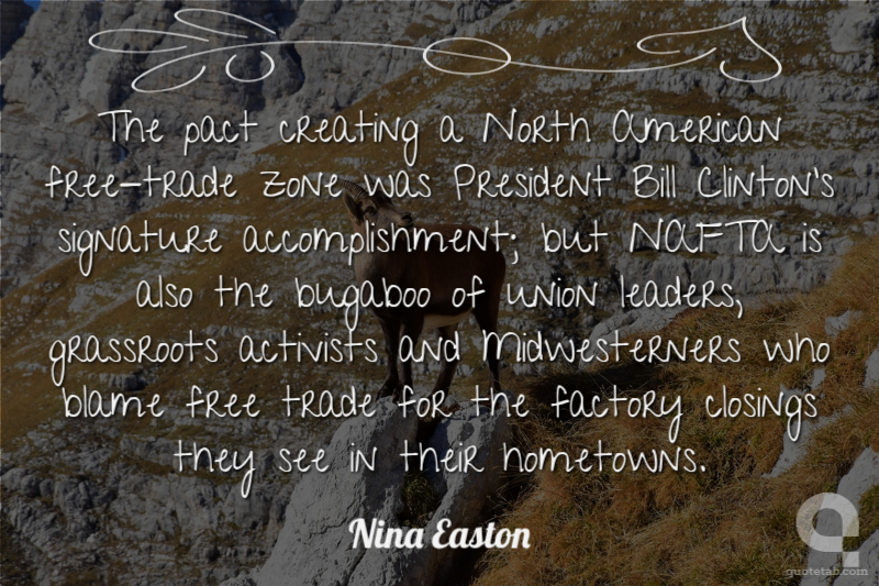 The pact creating a North American free-trade zone was President Bill Clinton's signature accomplishment; but NAFTA is also the bugaboo of union leaders, grassroots activists and Midwesterners who blame free trade for the factory closings they see in their hometowns. Nina Easton