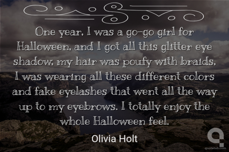 One year, I was a go-go girl for Halloween, and I got all this glitter eye shadow, my hair was poufy with braids, I was wearing all these different colors and fake eyelashes that went all the way up to my eyebrows. I totally enjoy the whole Halloween feel. Olivia Holt