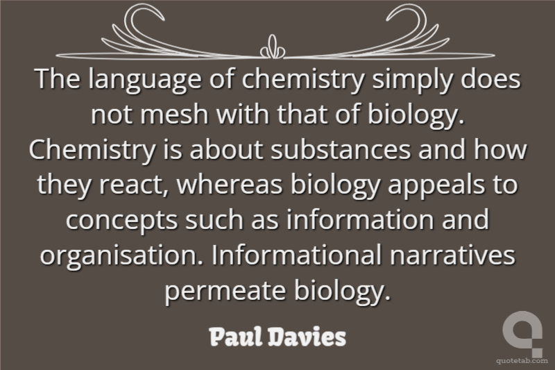 The language of chemistry simply does not mesh with that of biology. Chemistry is about substances and how they react, whereas biology appeals to concepts such as information and organisation. Informational narratives permeate biology. Paul Davies