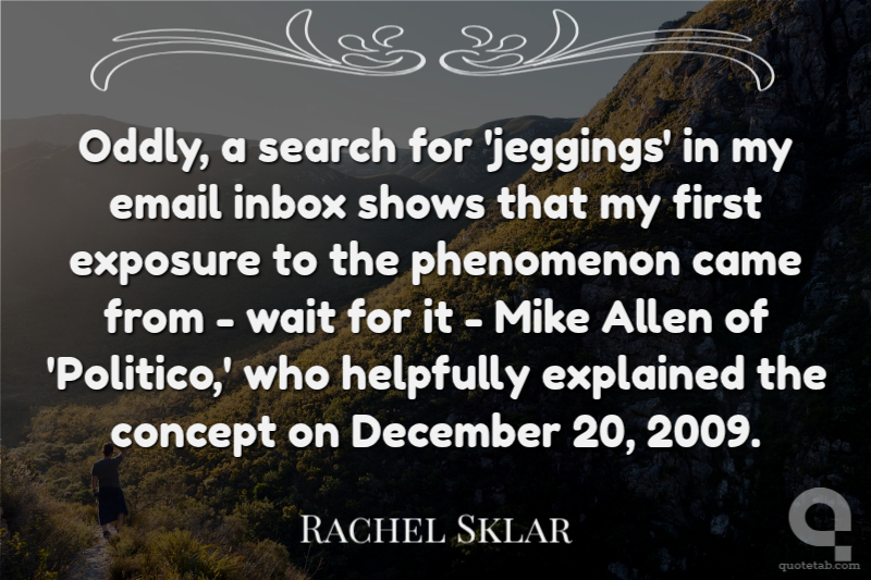 Oddly, a search for 'jeggings' in my email inbox shows that my first exposure to the phenomenon came from - wait for it - Mike Allen of 'Politico,' who helpfully explained the concept on December 20, 2009. Rachel Sklar