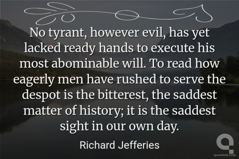 No tyrant, however evil, has yet lacked ready hands to execute his most abominable will. To read how eagerly men have rushed to serve the despot is the bitterest, the saddest matter of history; it is the saddest sight in our own day. Richard Jefferies