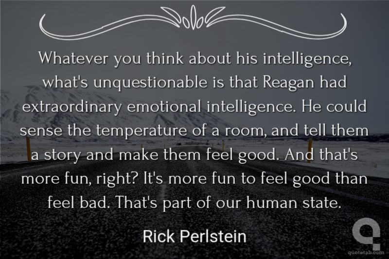 Whatever you think about his intelligence, what's unquestionable is that Reagan had extraordinary emotional intelligence. He could sense the temperature of a room, and tell them a story and make them feel good. And that's more fun, right? It's more fun to feel good than feel bad. That's part of our human state. Rick Perlstein