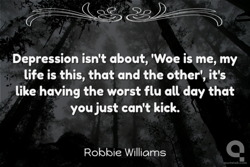 Depression isn't about, 'Woe is me, my life is this, that and the other', it's like having the worst flu all day that you just can't kick. Robbie Williams