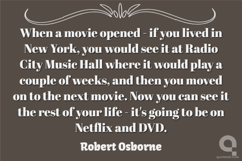 When a movie opened - if you lived in New York, you would see it at Radio City Music Hall where it would play a couple of weeks, and then you moved on to the next movie. Now you can see it the rest of your life - it's going to be on Netflix and DVD. Robert Osborne