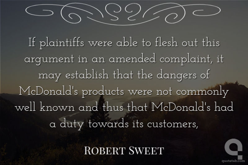 If plaintiffs were able to flesh out this argument in an amended complaint, it may establish that the dangers of McDonald's products were not commonly well known and thus that McDonald's had a duty towards its customers, Robert Sweet