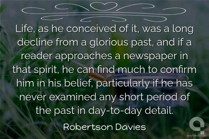 Life, as he conceived of it, was a long decline from a glorious past, and if a reader approaches a newspaper in that spirit, he can find much to confirm him in his belief, particularly if he has never examined any short period of the past in day-to-day detail. Robertson Davies
