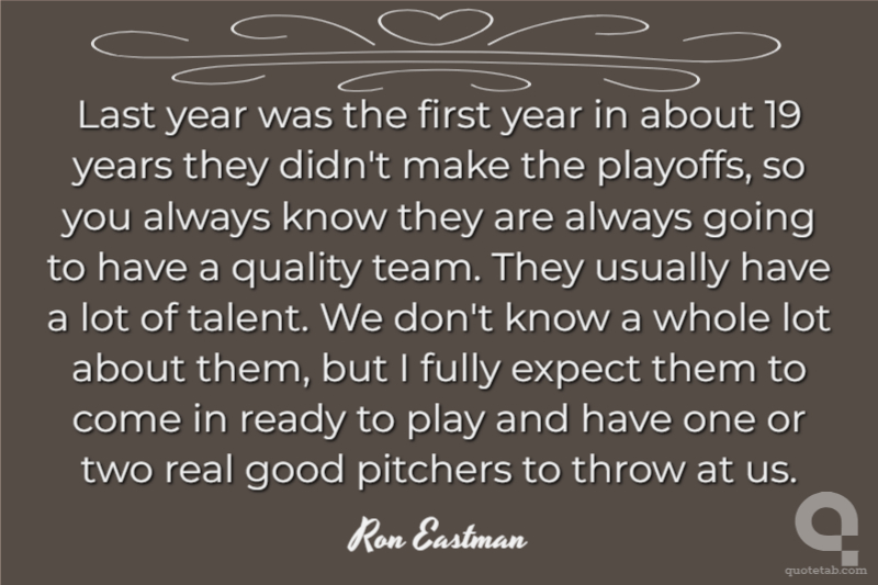 Last year was the first year in about 19 years they didn't make the playoffs, so you always know they are always going to have a quality team. They usually have a lot of talent. We don't know a whole lot about them, but I fully expect them to come in ready to play and have one or two real good pitchers to throw at us. Ron Eastman