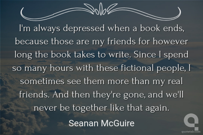 I'm always depressed when a book ends, because those are my friends for however long the book takes to write. Since I spend so many hours with these fictional people, I sometimes see them more than my real friends. And then they're gone, and we'll never be together like that again. Seanan McGuire