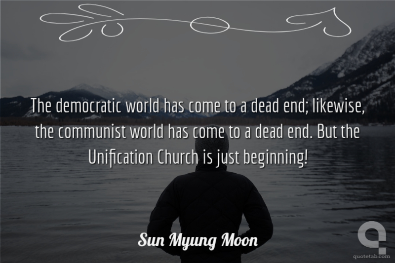 The democratic world has come to a dead end; likewise, the communist world has come to a dead end. But the Unification Church is just beginning! Sun Myung Moon