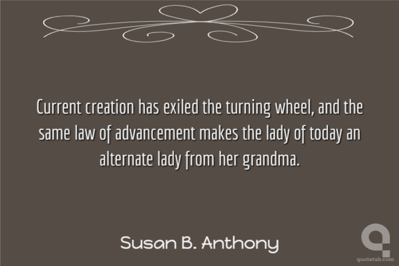 Current creation has exiled the turning wheel, and the same law of advancement makes the lady of today an alternate lady from her grandma. Susan B. Anthony