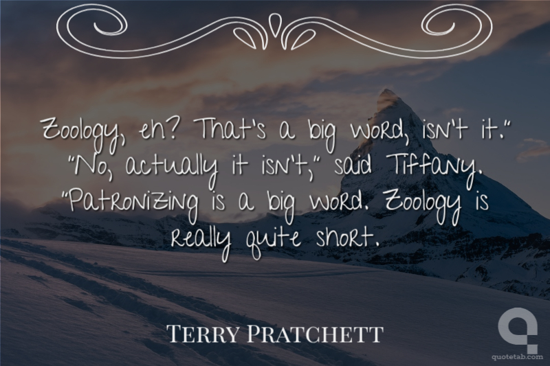 Zoology, eh? That's a big word, isn't it." "No, actually it isn't," said Tiffany. "Patronizing is a big word. Zoology is really quite short. Terry Pratchett