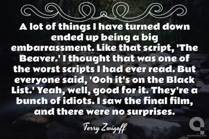 A lot of things I have turned down ended up being a big embarrassment. Like that script, 'The Beaver.' I thought that was one of the worst scripts I had ever read. But everyone said, 'Ooh it's on the Black List.' Yeah, well, good for it. They're a bunch of idiots. I saw the final film, and there were no surprises. Terry Zwigoff