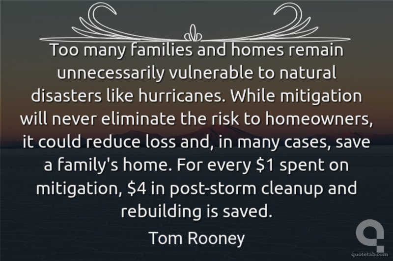 Too many families and homes remain unnecessarily vulnerable to natural disasters like hurricanes. While mitigation will never eliminate the risk to homeowners, it could reduce loss and, in many cases, save a family's home. For every $1 spent on mitigation, $4 in post-storm cleanup and rebuilding is saved. Tom Rooney