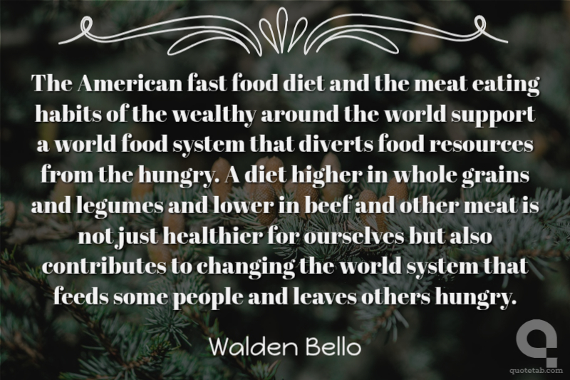 The American fast food diet and the meat eating habits of the wealthy around the world support a world food system that diverts food resources from the hungry. A diet higher in whole grains and legumes and lower in beef and other meat is not just healthier for ourselves but also contributes to changing the world system that feeds some people and leaves others hungry. Walden Bello