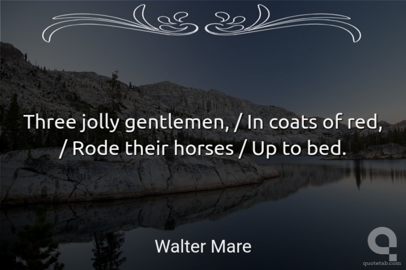 Three jolly gentlemen, / In coats of red, / Rode their horses / Up to bed. Walter Mare
