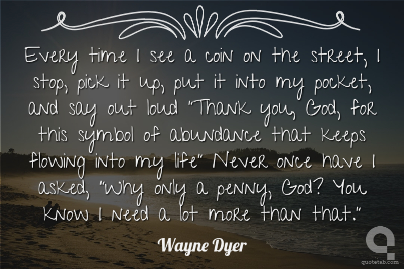 Every time I see a coin on the street, I stop, pick it up, put it into my pocket, and say out loud "Thank you, God, for this symbol of abundance that keeps flowing into my life" Never once have I asked, "Why only a penny, God? You know I need a lot more than that." Wayne Dyer