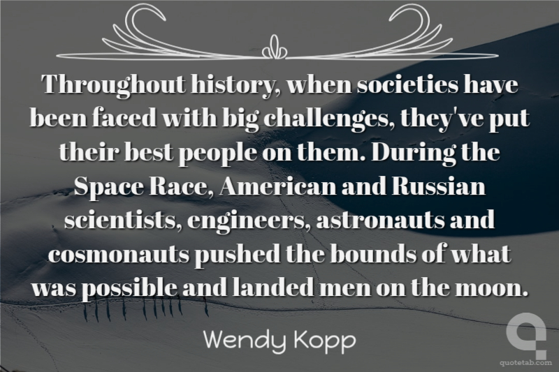 Throughout history, when societies have been faced with big challenges, they've put their best people on them. During the Space Race, American and Russian scientists, engineers, astronauts and cosmonauts pushed the bounds of what was possible and landed men on the moon. Wendy Kopp