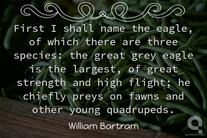 First I shall name the eagle, of which there are three species: the great grey eagle is the largest, of great strength and high flight; he chiefly preys on fawns and other young quadrupeds. William Bartram