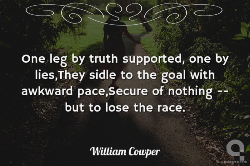 One leg by truth supported, one by lies,They sidle to the goal with awkward pace,Secure of nothing -- but to lose the race. William Cowper