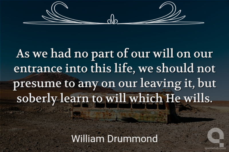 As we had no part of our will on our entrance into this life, we should not presume to any on our leaving it, but soberly learn to will which He wills. William Drummond