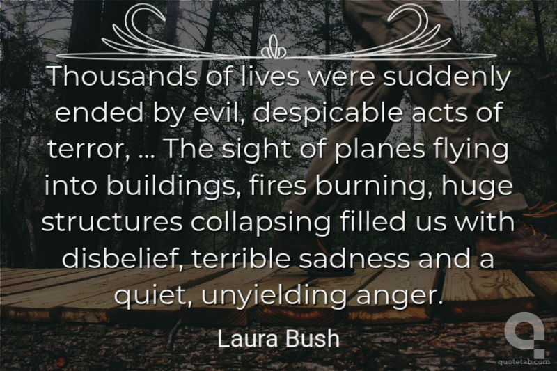 Thousands of lives were suddenly ended by evil, despicable acts of terror, ... The sight of planes flying into buildings, fires burning, huge structures collapsing filled us with disbelief, terrible sadness and a quiet, unyielding anger.