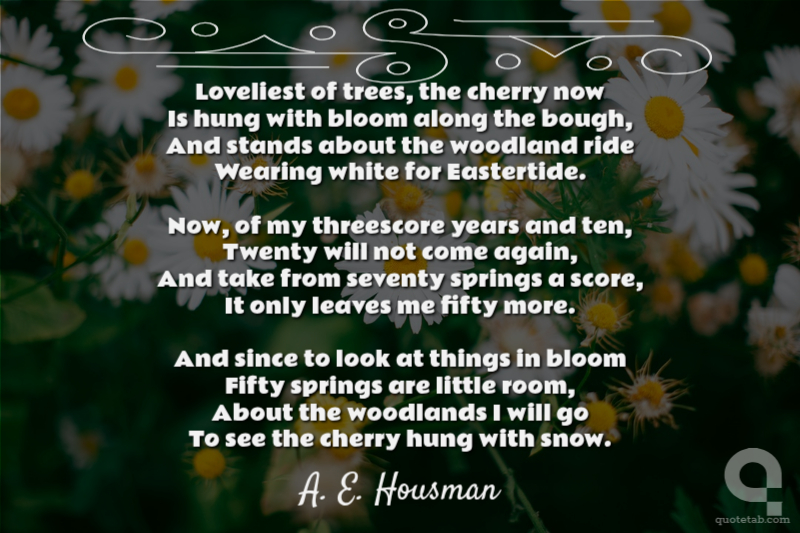 Loveliest of trees, the cherry now Is hung with bloom along the bough, And stands about the woodland ride Wearing white for Eastertide. Now, of my threescore years and ten, Twenty will not come again, And take from seventy springs a score, It only leaves me fifty more. And since to look at things in bloom Fifty springs are little room, About the woodlands I will go To see the cherry hung with snow.