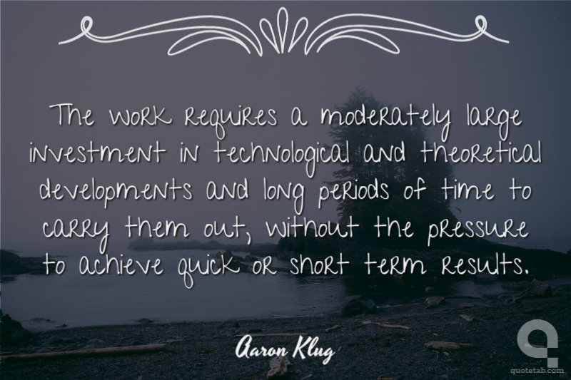 The work requires a moderately large investment in technological and theoretical developments and long periods of time to carry them out, without the pressure to achieve quick or short term results.