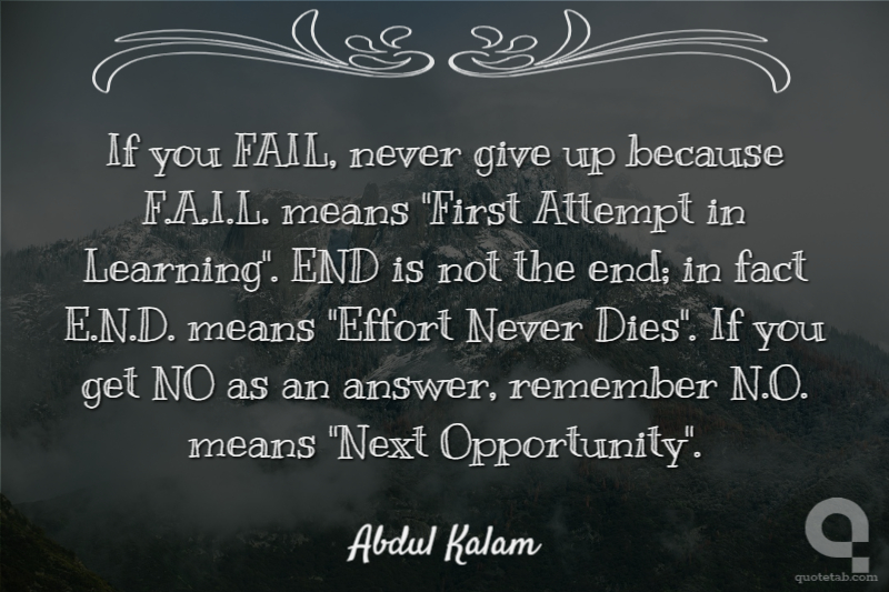 If you FAIL, never give up because F.A.I.L. means "First Attempt in Learning". END is not the end; in fact E.N.D. means "Effort Never Dies". If you get NO as an answer, remember N.O. means "Next Opportunity".