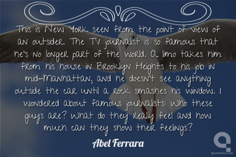 This is New York seen from the point of view of an outsider. The TV journalist is so famous that he's no longer part of the world. A limo takes him from his house in Brooklyn Heights to his job in mid-Manhattan, and he doesn't see anything outside the car until a rock smashes his window. I wondered about famous journalists: Who these guys are? What do they really feel and how much can they show their feelings?