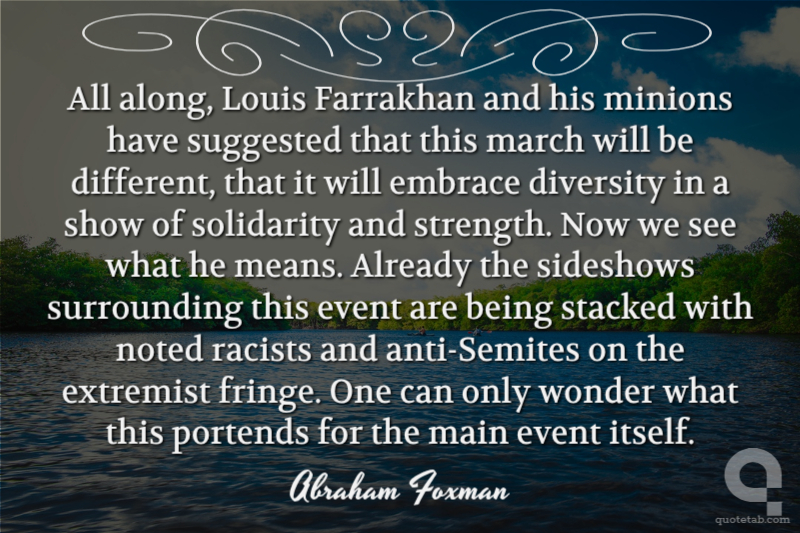 All along, Louis Farrakhan and his minions have suggested that this march will be different, that it will embrace diversity in a show of solidarity and strength. Now we see what he means. Already the sideshows surrounding this event are being stacked with noted racists and anti-Semites on the extremist fringe. One can only wonder what this portends for the main event itself.