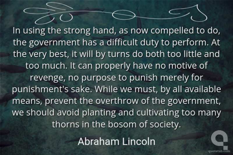 In using the strong hand, as now compelled to do, the government has a difficult duty to perform. At the very best, it will by turns do both too little and too much. It can properly have no motive of revenge, no purpose to punish merely for punishment's sake. While we must, by all available means, prevent the overthrow of the government, we should avoid planting and cultivating too many thorns in the bosom of society.