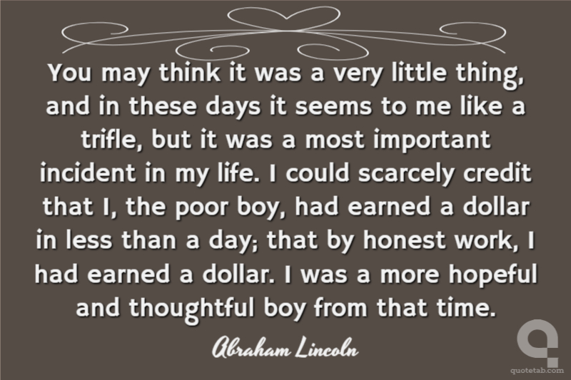 You may think it was a very little thing, and in these days it seems to me like a trifle, but it was a most important incident in my life. I could scarcely credit that I, the poor boy, had earned a dollar in less than a day; that by honest work, I had earned a dollar. I was a more hopeful and thoughtful boy from that time.