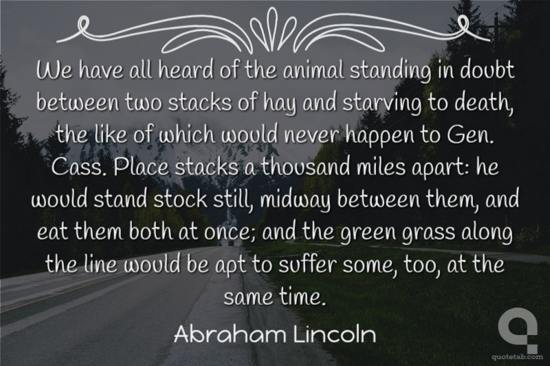 We have all heard of the animal standing in doubt between two stacks of hay and starving to death, the like of which would never happen to Gen. Cass. Place stacks a thousand miles apart: he would stand stock still, midway between them, and eat them both at once; and the green grass along the line would be apt to suffer some, too, at the same time.
