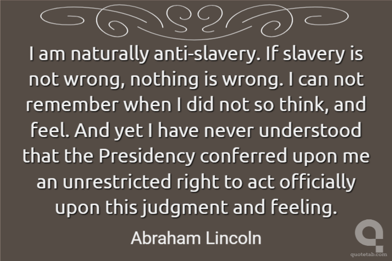 I am naturally anti-slavery. If slavery is not wrong, nothing is wrong. I can not remember when I did not so think, and feel. And yet I have never understood that the Presidency conferred upon me an unrestricted right to act officially upon this judgment and feeling.