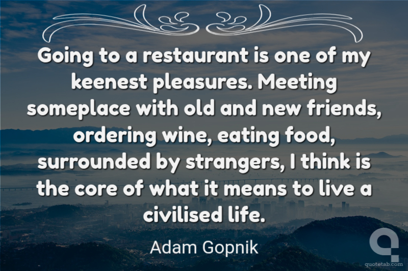Going to a restaurant is one of my keenest pleasures. Meeting someplace with old and new friends, ordering wine, eating food, surrounded by strangers, I think is the core of what it means to live a civilised life.