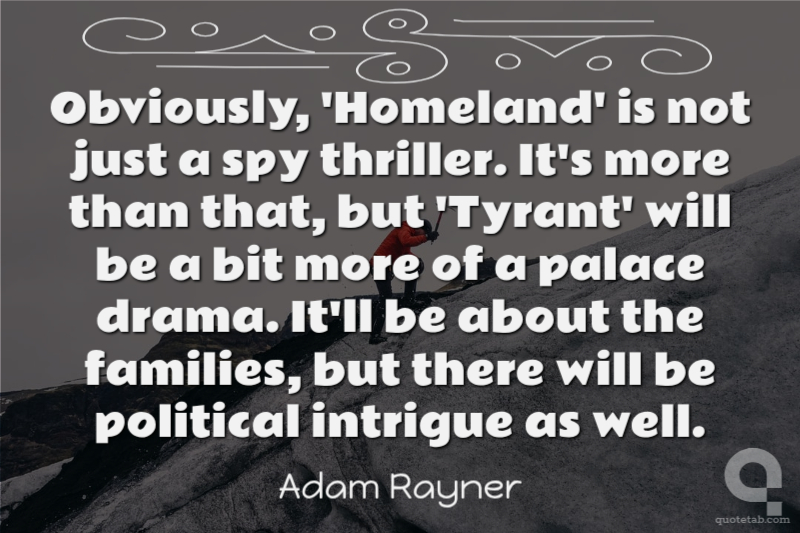 Obviously, 'Homeland' is not just a spy thriller. It's more than that, but 'Tyrant' will be a bit more of a palace drama. It'll be about the families, but there will be political intrigue as well.