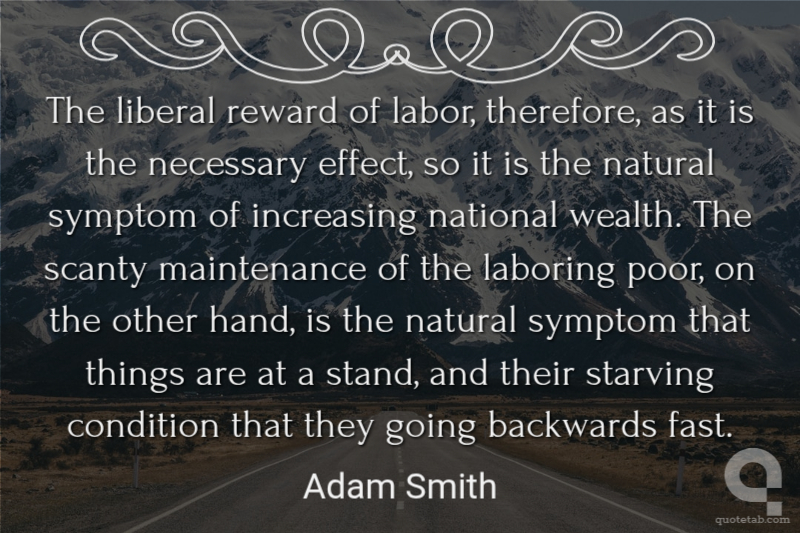 The liberal reward of labor, therefore, as it is the necessary effect, so it is the natural symptom of increasing national wealth. The scanty maintenance of the laboring poor, on the other hand, is the natural symptom that things are at a stand, and their starving condition that they going backwards fast.