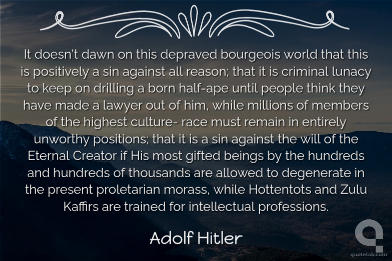 It doesn't dawn on this depraved bourgeois world that this is positively a sin against all reason; that it is criminal lunacy to keep on drilling a born half-ape until people think they have made a lawyer out of him, while millions of members of the highest culture- race must remain in entirely unworthy positions; that it is a sin against the will of the Eternal Creator if His most gifted beings by the hundreds and hundreds of thousands are allowed to degenerate in the present proletarian morass, while Hottentots and Zulu Kaffirs are trained for intellectual professions.