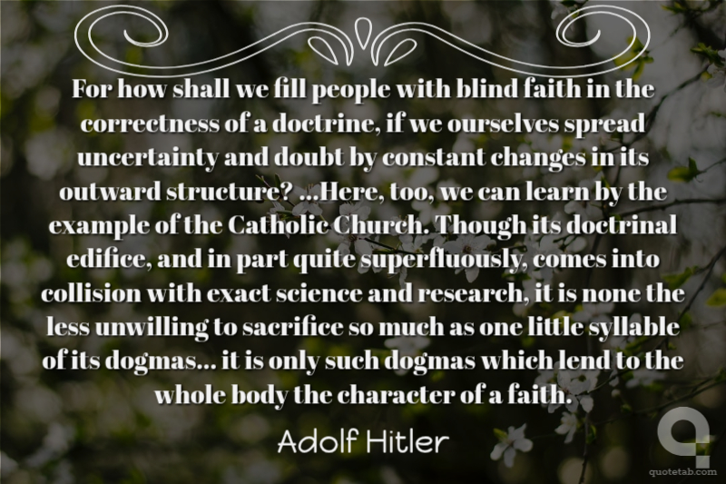 For how shall we fill people with blind faith in the correctness of a doctrine, if we ourselves spread uncertainty and doubt by constant changes in its outward structure? ...Here, too, we can learn by the example of the Catholic Church. Though its doctrinal edifice, and in part quite superfluously, comes into collision with exact science and research, it is none the less unwilling to sacrifice so much as one little syllable of its dogmas... it is only such dogmas which lend to the whole body the character of a faith.