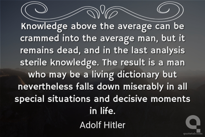 Knowledge above the average can be crammed into the average man, but it remains dead, and in the last analysis sterile knowledge. The result is a man who may be a living dictionary but nevertheless falls down miserably in all special situations and decisive moments in life.