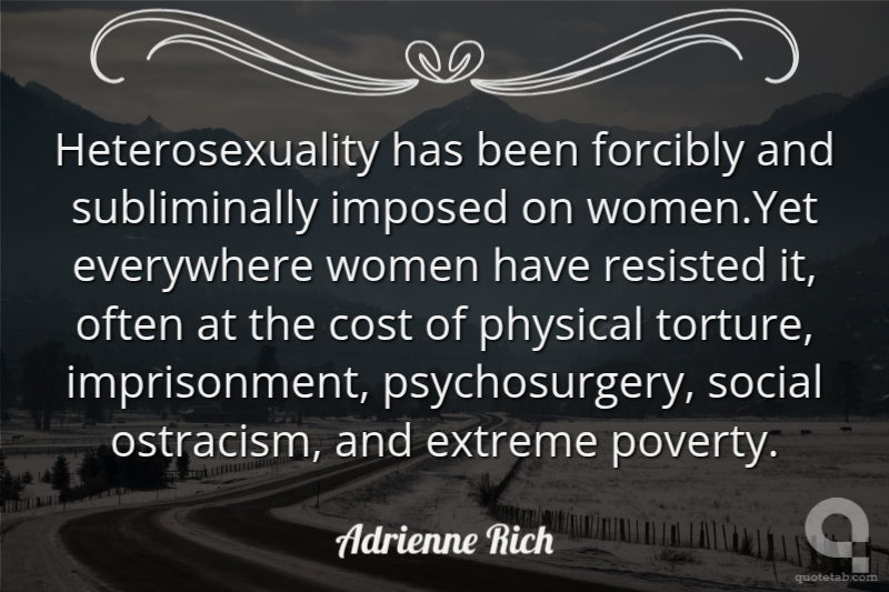 Heterosexuality has been forcibly and subliminally imposed on women.Yet everywhere women have resisted it, often at the cost of physical torture, imprisonment, psychosurgery, social ostracism, and extreme poverty.