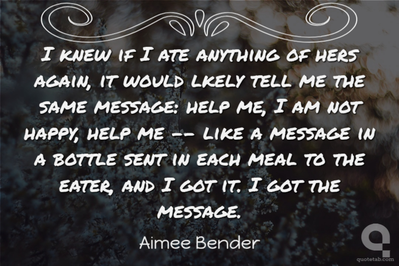 I knew if I ate anything of hers again, it would lkely tell me the same message: help me, I am not happy, help me -- like a message in a bottle sent in each meal to the eater, and I got it. I got the message.