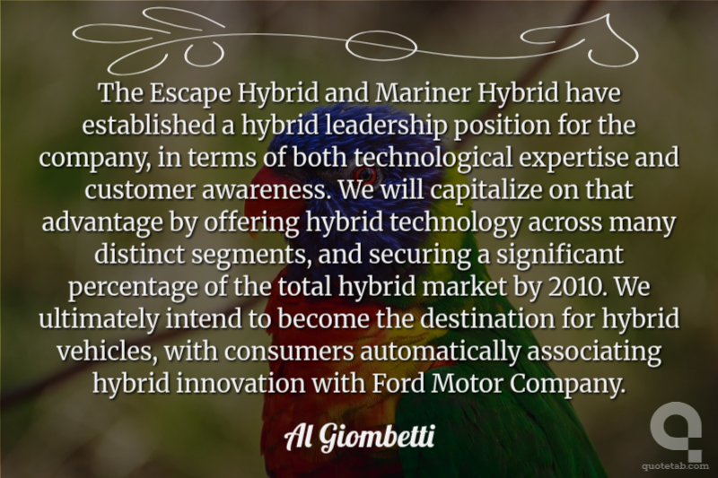 The Escape Hybrid and Mariner Hybrid have established a hybrid leadership position for the company, in terms of both technological expertise and customer awareness. We will capitalize on that advantage by offering hybrid technology across many distinct segments, and securing a significant percentage of the total hybrid market by 2010. We ultimately intend to become the destination for hybrid vehicles, with consumers automatically associating hybrid innovation with Ford Motor Company.