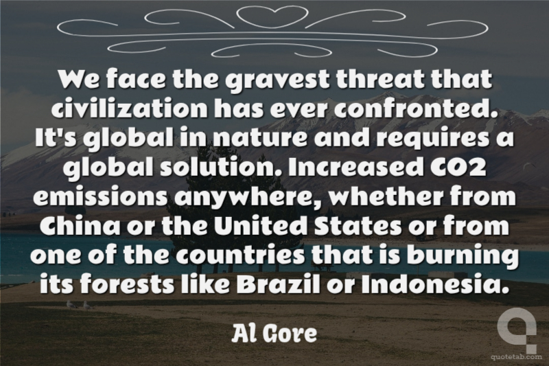 We face the gravest threat that civilization has ever confronted. It's global in nature and requires a global solution. Increased CO2 emissions anywhere, whether from China or the United States or from one of the countries that is burning its forests like Brazil or Indonesia.