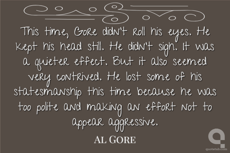 This time, Gore didn't roll his eyes. He kept his head still. He didn't sigh. It was a quieter effect. But it also seemed very contrived. He lost some of his statesmanship this time because he was too polite and making an effort not to appear aggressive.