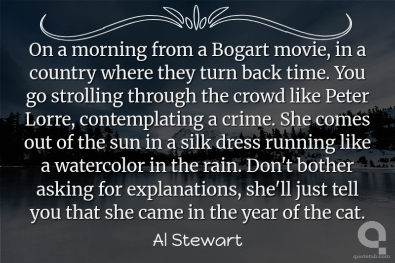On a morning from a Bogart movie, in a country where they turn back time. You go strolling through the crowd like Peter Lorre, contemplating a crime. She comes out of the sun in a silk dress running like a watercolor in the rain. Don't bother asking for explanations, she'll just tell you that she came in the year of the cat.