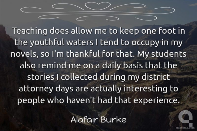 Teaching does allow me to keep one foot in the youthful waters I tend to occupy in my novels, so I'm thankful for that. My students also remind me on a daily basis that the stories I collected during my district attorney days are actually interesting to people who haven't had that experience.