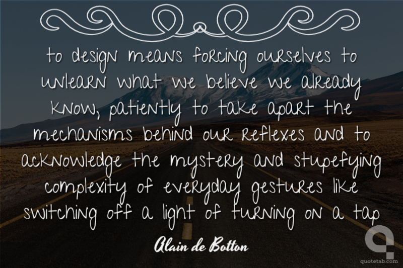 to design means forcing ourselves to unlearn what we believe we already know, patiently to take apart the mechanisms behind our reflexes and to acknowledge the mystery and stupefying complexity of everyday gestures like switching off a light of turning on a tap