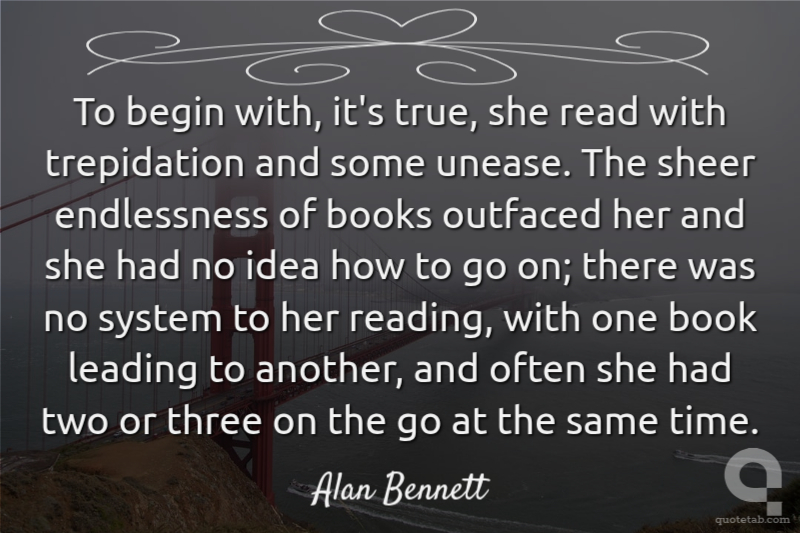 To begin with, it's true, she read with trepidation and some unease. The sheer endlessness of books outfaced her and she had no idea how to go on; there was no system to her reading, with one book leading to another, and often she had two or three on the go at the same time.