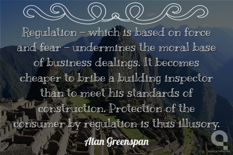 Regulation - which is based on force and fear - undermines the moral base of business dealings. It becomes cheaper to bribe a building inspector than to meet his standards of construction. Protection of the consumer by regulation is thus illusory.